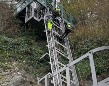 - Removal of old lift ropes and fitting of new ones, involving abseilers.